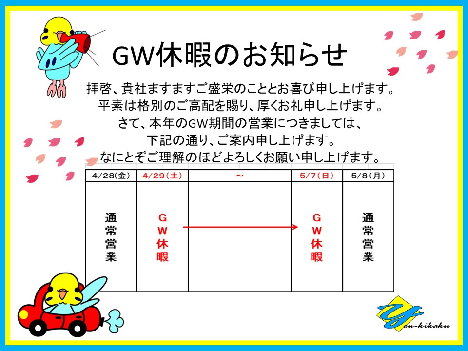 ユー企画住販 > 有限会社ユー企画住販のスタッフブログ記事一覧 > GW休暇のお知らせ