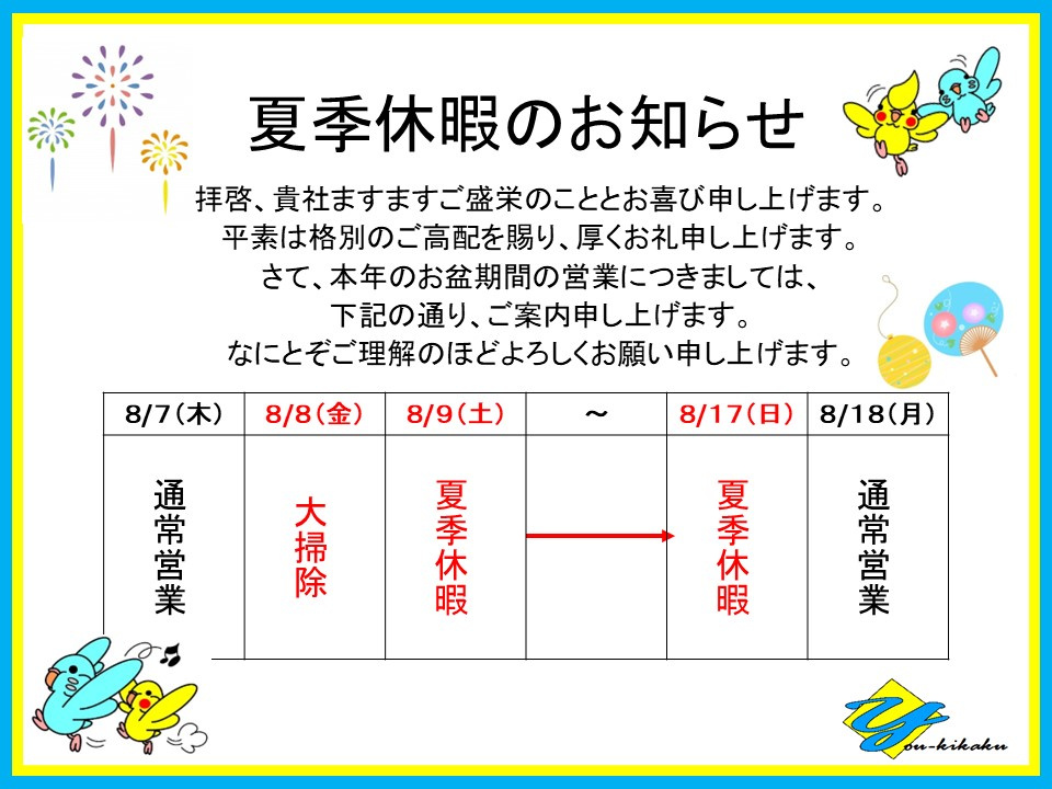 夏季休暇のお知らせ!